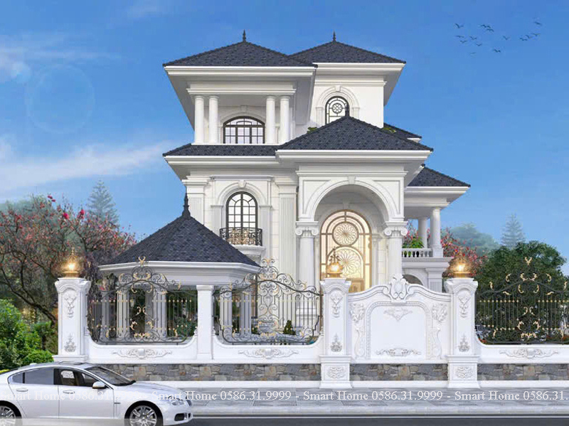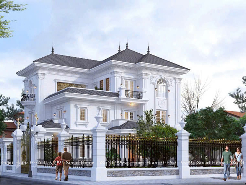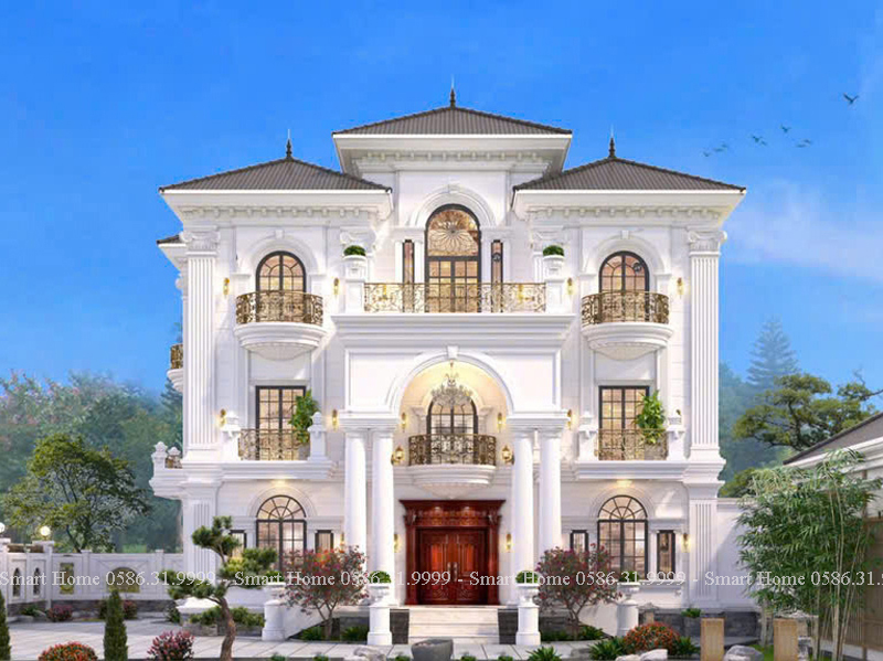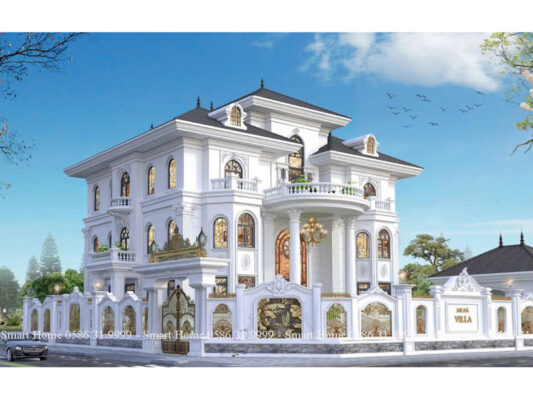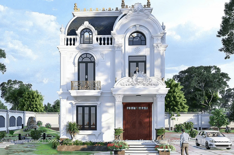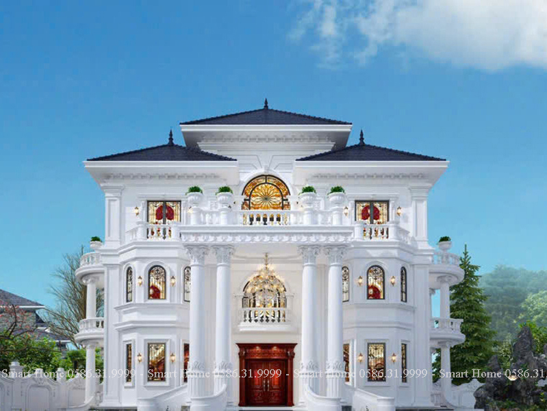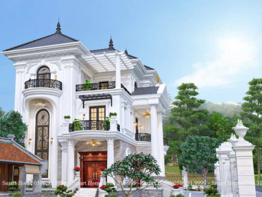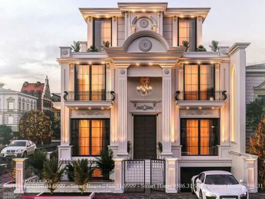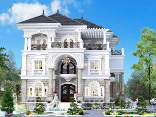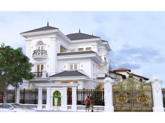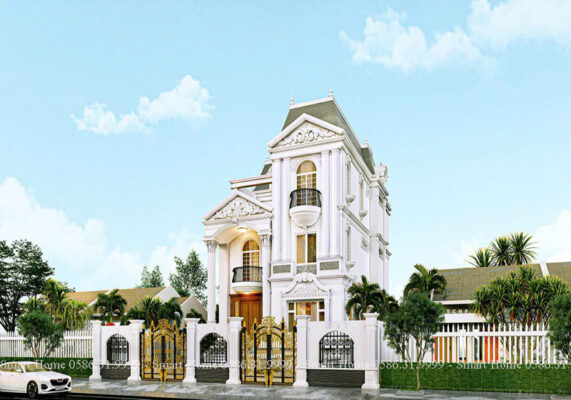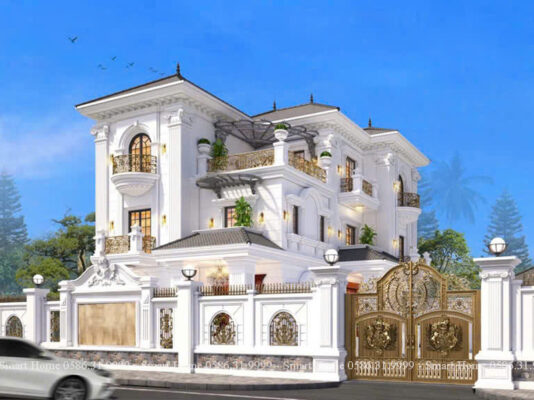 Ngôi biệt thự nổi bật với phong cách tân cổ điển châu Âu, được thể hiện rõ qua từng chi tiết kiến trúc tinh xảo, màu sắc quý phái và bố cục đối xứng cân đối. Đây là mẫu thiết kế mang vẻ đẹp vượt thời gian, biểu tượng cho sự sang trọng và quyền lực.