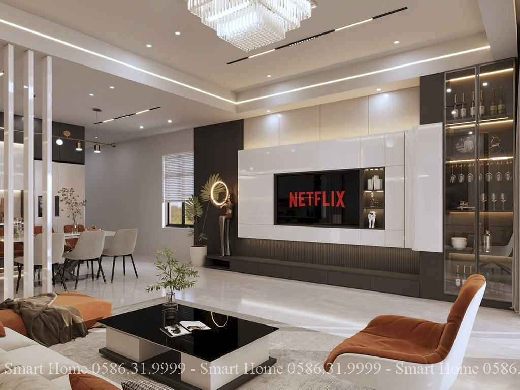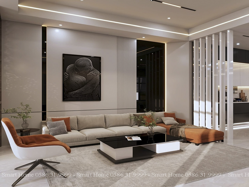 Phòng khách sử dụng bảng màu trung tính hiện đại gồm: trắng, be, cam đất và đen, giúp tạo nên không gian ấm cúng nhưng vẫn sang trọng. Chất liệu đá bóng lớn, gỗ ốp tường, và kính cao cấp được kết hợp một cách tinh tế, vừa đảm bảo độ bền, vừa tăng giá trị thẩm mỹ.