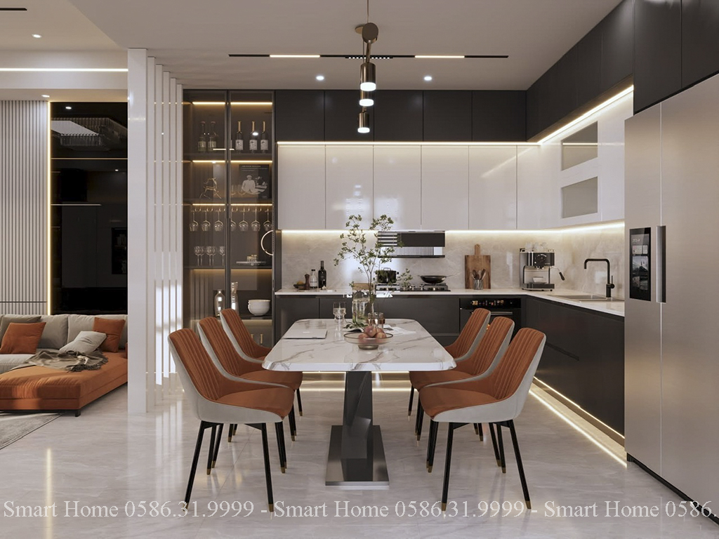 Không gian được thiết kế mở hoàn toàn, kết nối liền mạch giữa phòng khách, khu bàn ăn và góc bếp – mang lại cảm giác rộng rãi, thoáng đãng và tràn ngập ánh sáng tự nhiên. Vách lam trắng ngăn nhẹ giữa các khu vực, vừa tạo phân tách tinh tế, vừa không làm mất đi sự liên kết chung.