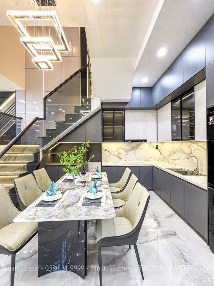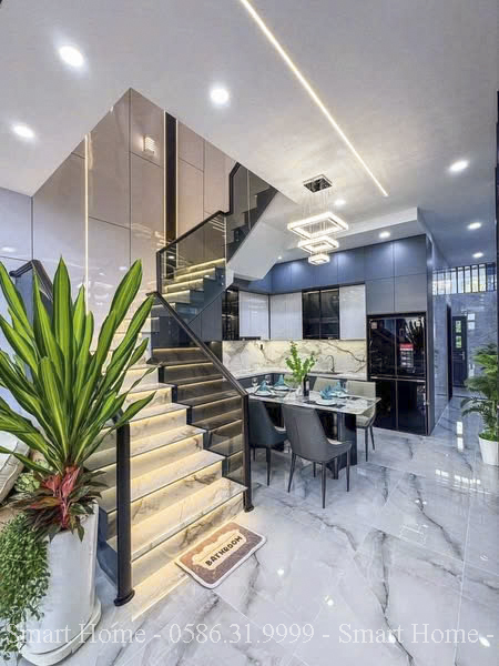 Tầng trệt sử dụng cổng sắt hoa văn chéo chắc chắn, hai bên ốp gạch trang trí đồng bộ với mặt tiền. Tổng thể công trình mang đậm phong cách hiện đại, tối ưu công năng và thẩm mỹ – là lựa chọn lý tưởng cho những ai yêu thích lối sống tiện nghi, thời thượng.