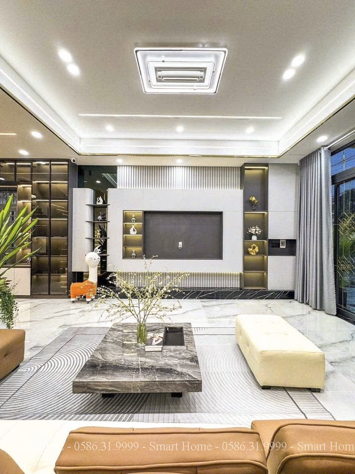 • Trần nhà sơn trắng, tích hợp hệ thống đèn LED âm trầnđiều hòa âm trần, làm nổi bật thiết kế tối giản nhưng hiện đại