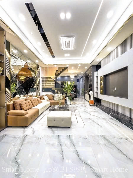 • Sàn lát đá bóng kiếng vân mây xám trắng, phản chiếu ánh sáng tốt, góp phần mở rộng không gian và mang lại vẻ sạch sẽ tinh tế.