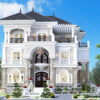 Căn nhà sử dụng tone trắng kem kết hợp với xám nhạt mang đến cảm giác thanh thoát, nhẹ nhàng nhưng vẫn nổi bật. Hệ cột trụ vuông vức ốp đá sang trọng giúp tôn lên vẻ vững chãi và đẳng cấp cho toàn bộ công trình. Các đường phào chỉ nhẹ tạo chiều sâu và sự tinh tế trong từng chi tiết.